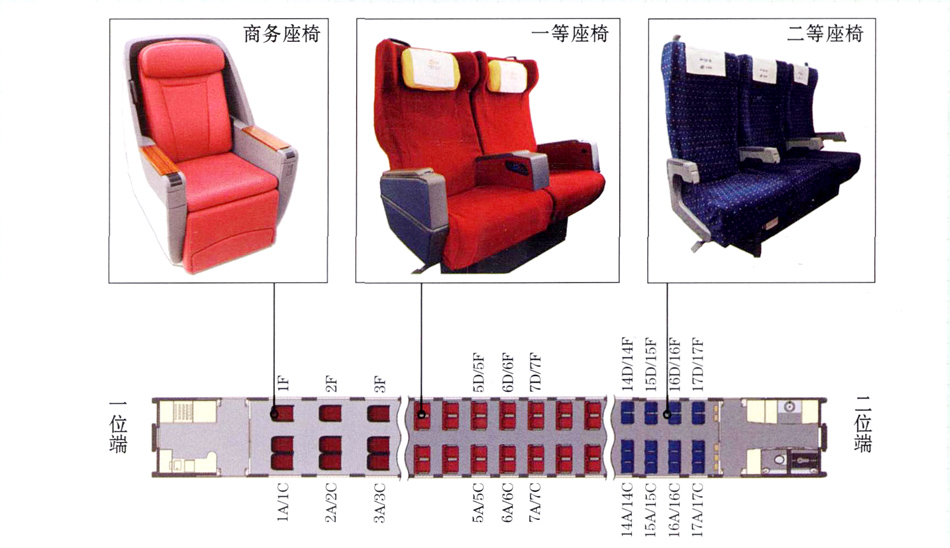 动车组旅客列车座席排号类似航空的飞机席位编码方式,从车厢一位端开始按顺序编排,用阿拉伯数字表示。座椅位置采用A、B、C、D、F共5个字母表示,其中3+2座椅排列中,3入座椅用A、B、C表示,2人座椅用D、F表示:2+2座椅排列分别用A、C和D、F表示:2+1座椅排列分别用A、C和F表示。无论是何种座席排列,A、F代表靠窗座席,C、D代表靠过道座席。