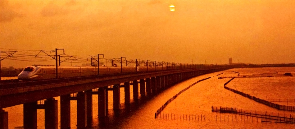 高速列车飞驰在京沪高铁阳澄湖桥上