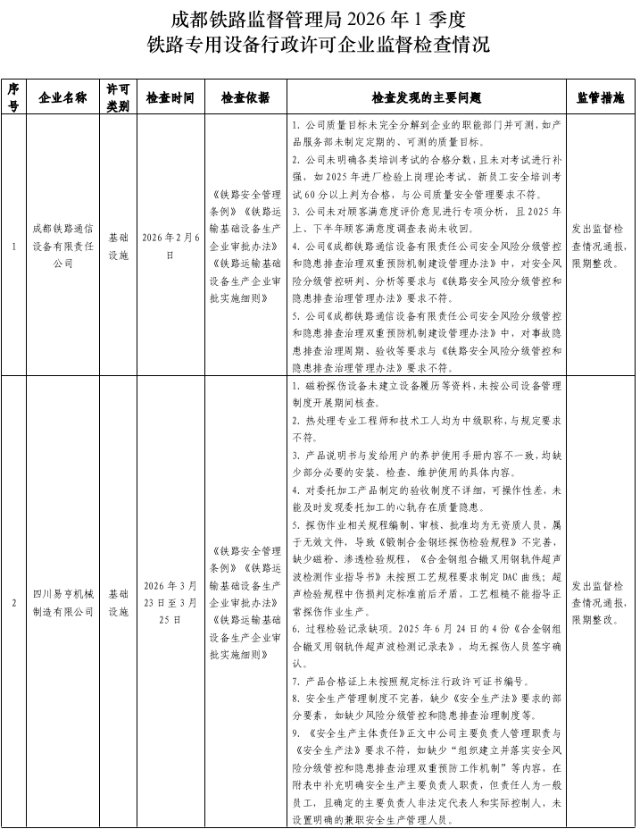 2026年1季度,成都铁路监督管理局依据《中华人民共和国行政许可法》《铁路安全管理条例》《铁路机车车辆设计制造维修进口许可办法》《铁路运输基础设备生产企业审批办法》等法律法规、规章规范,按照《国家铁路局关于印发〈2026年度铁路专用设备行政许可企业监督检查计划〉的通知》(国铁设备监函〔2026〕13号)要求,依法对成都铁路通信设备有限责任公司、四川易亨机械制造有限公司共2家企业开展铁路专用设备行政许可企业监督检查,发现问题14项,发出检查通报2份,要求受检企业对监督检查发现的问题进行整改,并将整改措施和整改情况及时报送成都铁路监督管理局。现将监督检查情况通报如下: