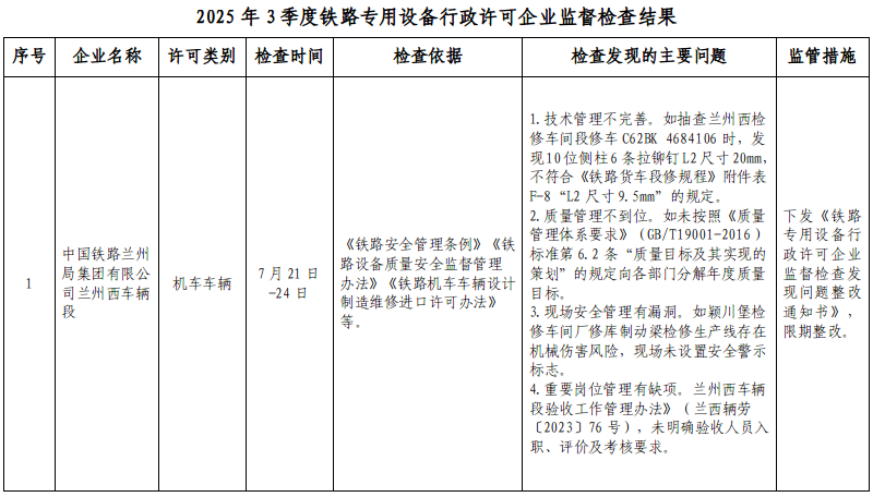 2025年3季度,兰州铁路监督管理局按照铁路专用设备行政许可相关法律法规和文件规定,依据《国家铁路局关于印发<2025年度铁路专用设备行政许可企业监督检查计划>的通知》(国铁设备监函〔2025〕8号),检查铁路专用设备行政许可企业1家,下发《铁路专用设备行政许可企业监督检查发现问题整改通知书》1份。要求受检企业对监督检查发现的问题进行整改,将整改措施和整改情况及时报兰州铁路监督管理局。现将监督检查结果通报如下: