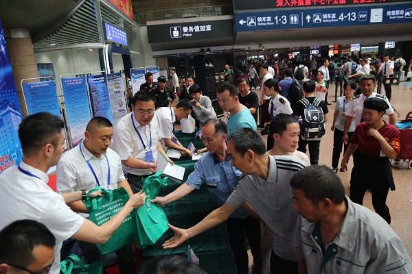 国家铁路局工作人员向旅客发放铁路安全生产宣传资料